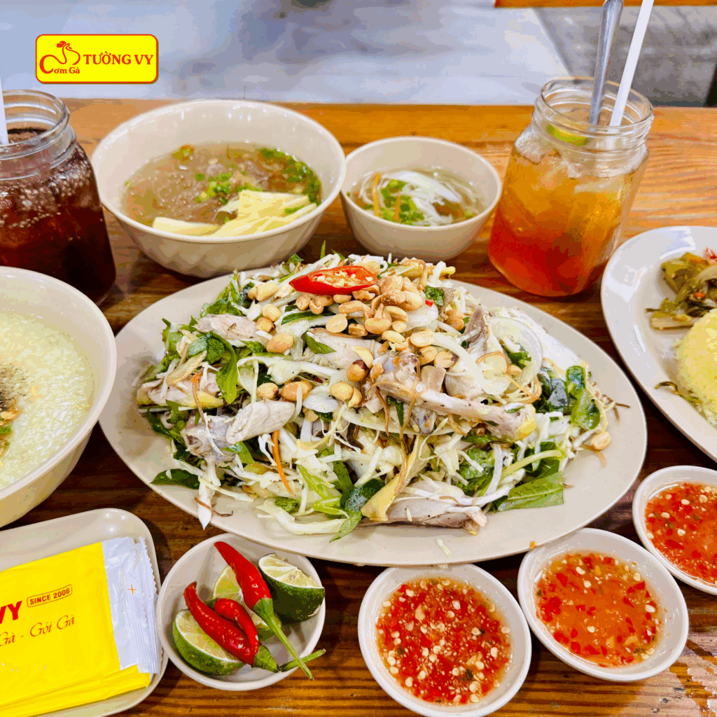 👉 Vị chua thanh và giòn mát của gỏi giúp cân bằng hương vị, khiến mỗi miếng gà, miếng lòng càng thêm đậm đà.