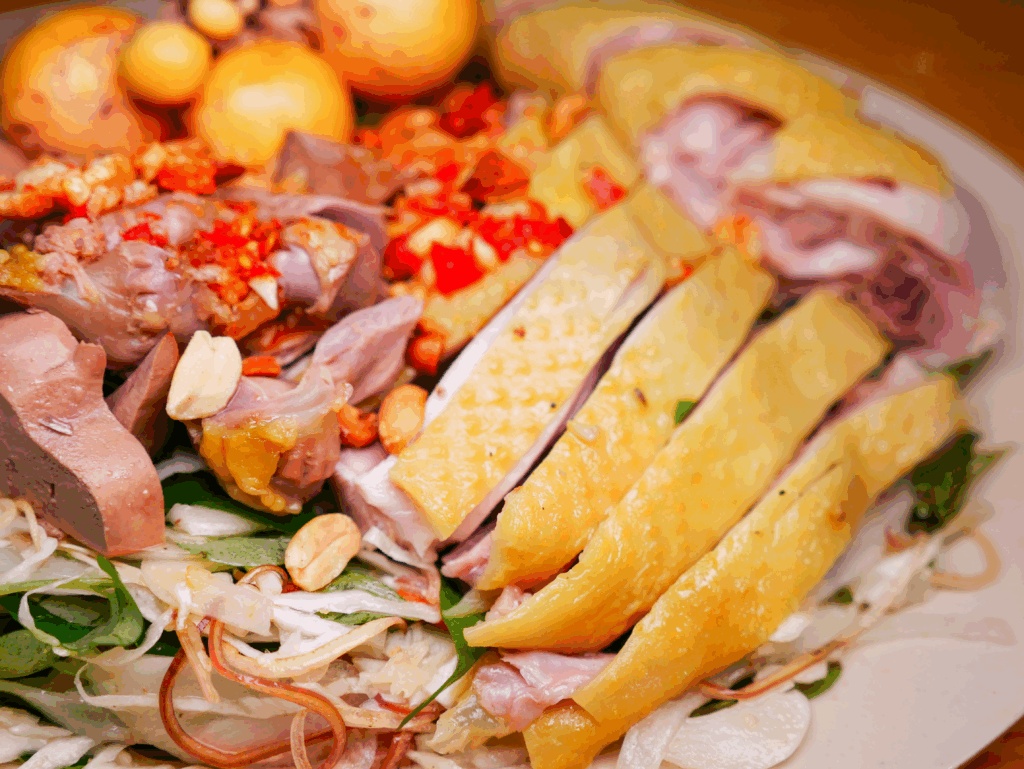 Gà dùng trong món này là gà ta thả vườn, loại gà được nuôi kỹ lưỡng, thịt chắc – da mỏng – xương nhỏ. Gà được luộc với gừng, hành, muối hột và một chút rượu trắng, giữ được độ trong của nước, không tanh, và thơm dịu.