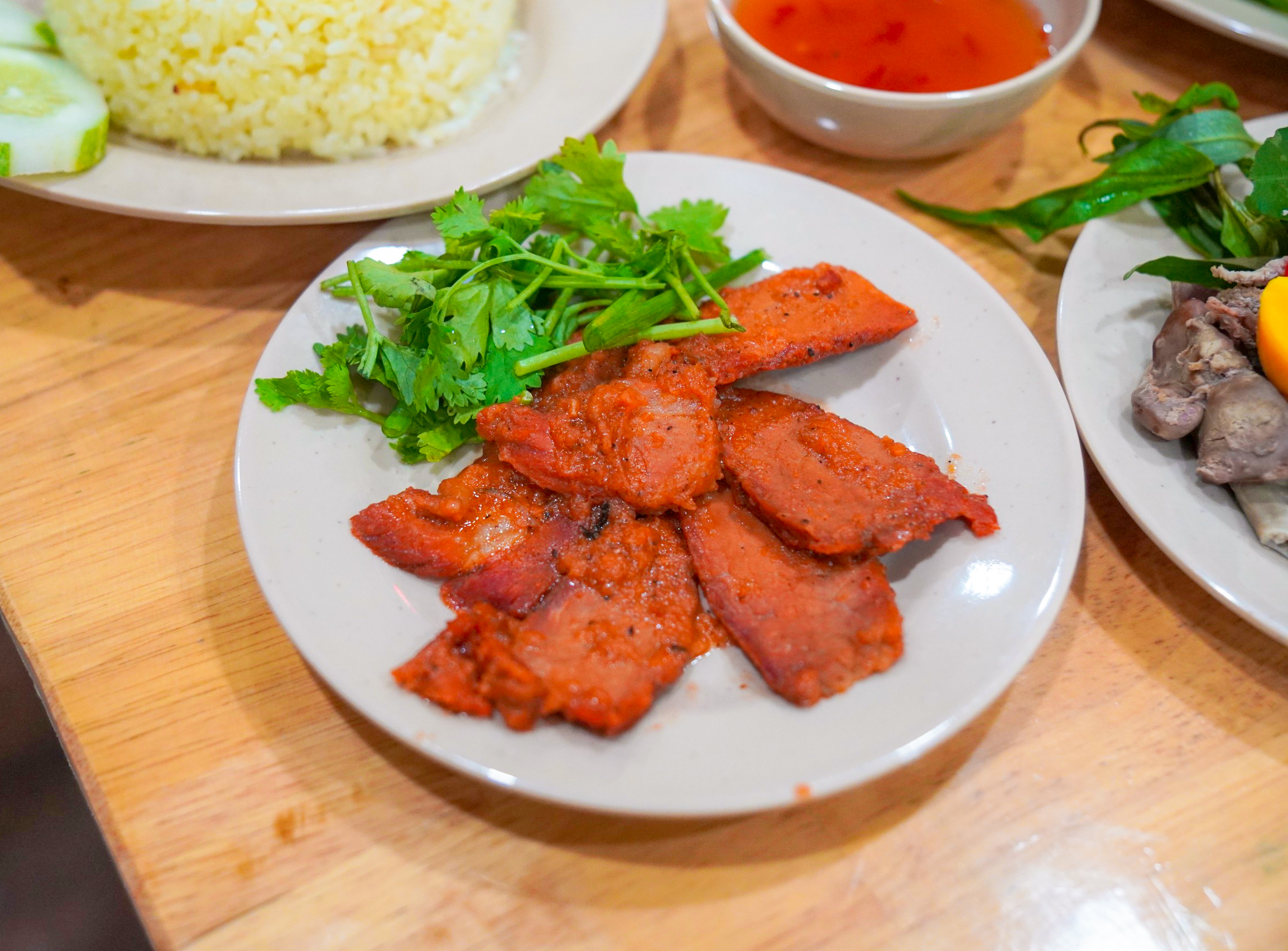 Không nhiều người để ý đến chén nước sốt nhỏ xíu nằm bên góc đĩa, nhưng thực ra nó là thứ khiến món cơm gà này “khác bọt”. Sốt được làm từ gừng tươi giã nhuyễn, hành lá cắt nhuyễn, pha với nước tương, dầu mè và một chút đường nâu, tạo nên một thứ gia vị thơm nức, ngòn ngọt – mằn mặn – cay nhẹ.